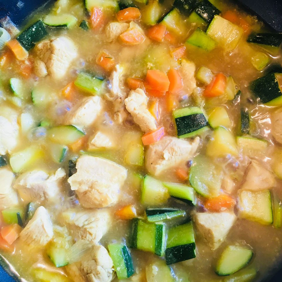 prévoir environ 45mn avec la cuisson - dans un wok ou un faitout chauffer l’huile d’olive,l’oignon émincé, les carottes émincées, les morceaux de viande poulet, ajouter 1 à 2 c. À café de curry, laisser mijoter et ajouter les courgettes, l’eau avec le bouillon cube. Couvrir et laisser mijoter 20mn. Ajouter les nouilles chinoises et laisser mijoter 10mn de plus.